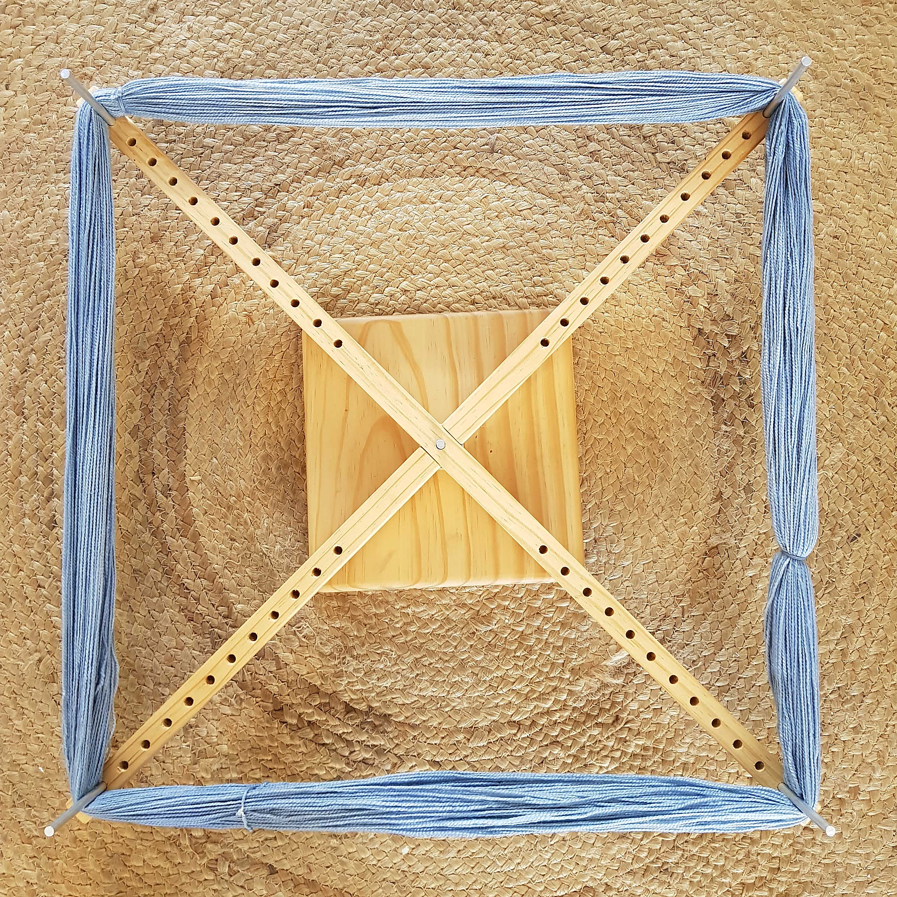 Take you skein, and pull it over the four corners/pegs of your swift. Not all skeins are the same length, therefor it is helpful to have a swift with adjustable pegs.